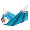 Die Hängematte erinnert durch ihre mehrfarbigen Blautöne an eine Lagune, in die du dich nur noch reinlegen musst. Anders als eine Lagune kannst du die Hängematte dank des leicht aufbaubaren Gestells dort platzieren, wo es dir beliebt.
