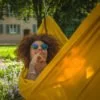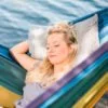 Wo gibt’s denn sowas? Diese Frage wirst Du in Begleitung von „Camino“ wohl öfter beantworten müssen, denn das Vorzeige-Modell von HängemattenGlück ist einfach bildschön. Es besteht aus fair gehandelter Bio-Baumwolle und erreicht Dich zusammen mit einer multifunktionalen Packtasche. Sie kann als Reisekissen fungieren oder nimmt beim Schaukeln allerlei Utensilien auf. Ganz, wie es Dir und „Camino“ gefällt