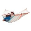 Mit ihrer dezenten aber doch sommerlichen Farbgebung macht diese Hängematte schon beim Ansehen Spaß. Durch die Stabaufhängung am Gestell sorgt sie für eine stabile Liegeposition, was der Entspannung jedoch absolut nichts abtut.